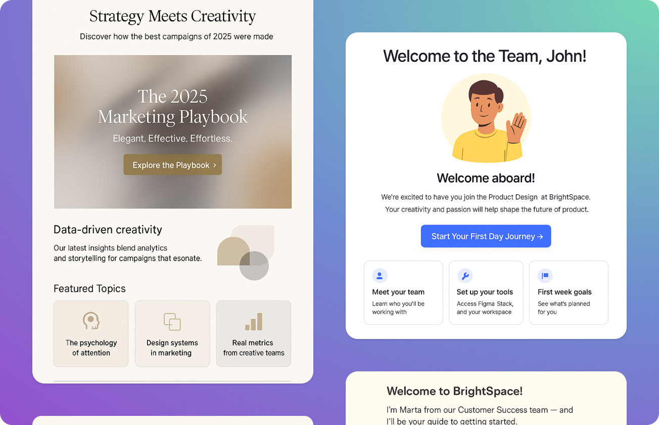 Build templates once with automatic permission inheritance. No more recreating the same email three times for different user types.