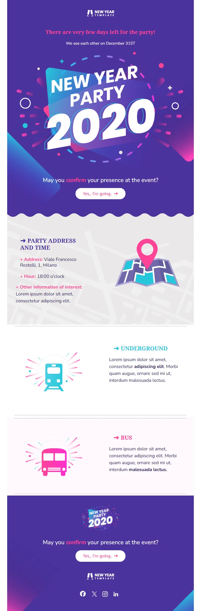 A festive New Year's Eve party invitation email featuring event details, location information, transportation options, and prominent RSVP buttons. Perfect for holiday celebrations, corporate parties, and special event invitations.